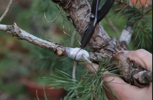 Innesti per approssimazione su un prebonsai di pino per creare ramificazione dove la pianta ne è sp…